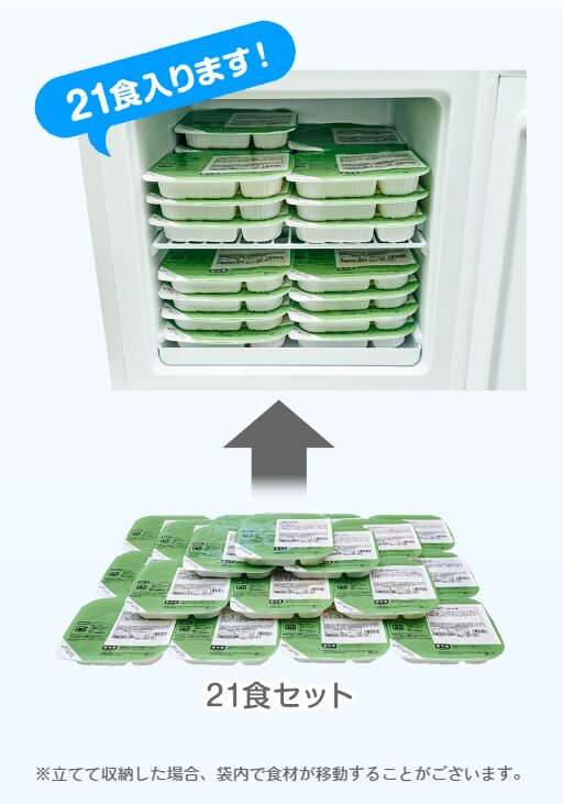 14食、21食の定期便を注文の方に限りますが、冷凍庫がない方や普段冷凍庫がパンパンで入りきらない方には便利なサービスだと思います。